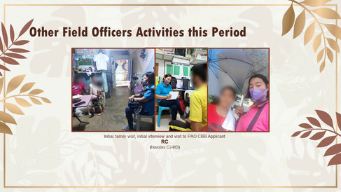 Aside from the weekly monitoring of our released Participants, our Program Field Officers likewise were unfailing in conducting initial home and barangay visits for applicants, coordinating with barangay officials & PAO lawyers, and the processing of bail for CBB Applicants.