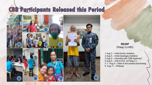 Aside from the weekly monitoring of our released Participants, our Program Field Officers likewise were unfailing in conducting initial home and barangay visits for applicants, coordinating with barangay officials & PAO lawyers, and the processing of bail for CBB Applicants.