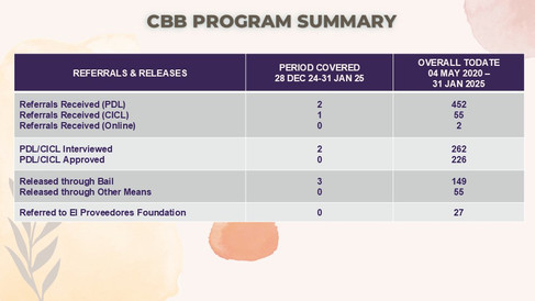 For this period, we were able to successfully release 3 CBB Participants from detention. All were released through bail. They join the 201 other CBB Participants that have been released, all of whom we are assisting towards community reintegration.