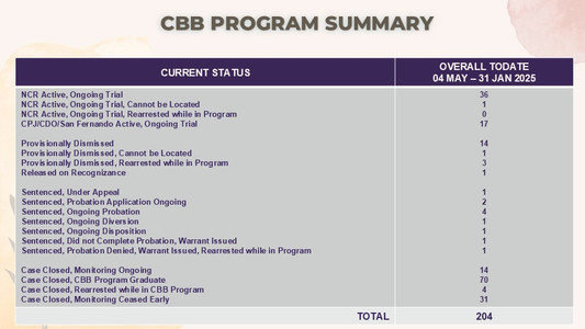 More significantly, we have a total of 70 CBB Participants who have successfully graduated from the CBB Program. We consider participants as having successfully graduated from the Program after their cases have been closed, and at least another six months of monitoring have elapsed. Throughout this period, they must have shown to be responsible members of their community and can lead productive lives.