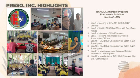 The BANDILA (Bagong Buhay ng Dating Inalisan ng Laya) Aftercare Program of the Manila City Jail Male Dormitory, which is being implemented with the Missionary Sisters of St. Columban and supported by PRESO, Inc. was formally launched last January 30. Prior to this, a series of coordination meetings with MCJ-MD Management and the MCJ-MD Visitors Association, and orientation sessions with PDL due for release from January-March 2025 were conducted.