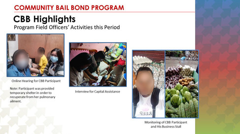 We enter our fourteenth month of the Community Bail Bond Program still undaunted by the challenges brought about by a prolonged pandemic. The criminal justice system continues to reel from the ravages of repetitive lockdowns that have resulted in further delays in the conduct of court hearings and the resolution of court cases. More than ever our CBB Program has become a beacon of hope for deserving PDL and CICL. Our CBB Program Field Officers were unfailing in their duties of conducting weekly monitoring/home visits of referrals & successfully released participants, attending court hearings, coordinating with barangay officials & PAO lawyers, and the processing of bail.