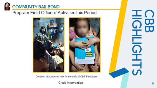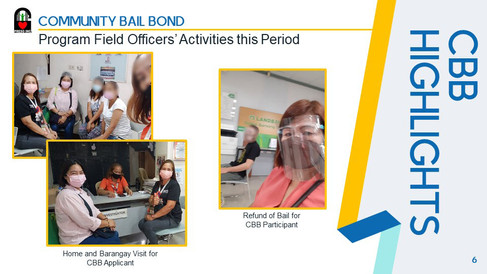 Our Community Bail Bond Program is into its seventeenth month of implementation and we continue to persevere in helping Persons Deprived of Liberty (PDL) and Children in Conflict with the Law (CICL) obtain early release from detention through bail and other methods of release. The CBB Program has become a beacon of hope for deserving PDL and CICL. Our CBB Program Field Officers were unfailing in their duties of conducting weekly monitoring/home visits of referrals & successfully released participants.