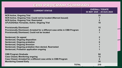 More significantly, we have a total of 84 CBB Participants who have successfully graduated from the CBB Program. We consider participants as having successfully graduated from the Program after their cases have been closed, and at least another six months of monitoring have elapsed. Throughout this period, they must have shown to be responsible members of their community and can lead productive lives.